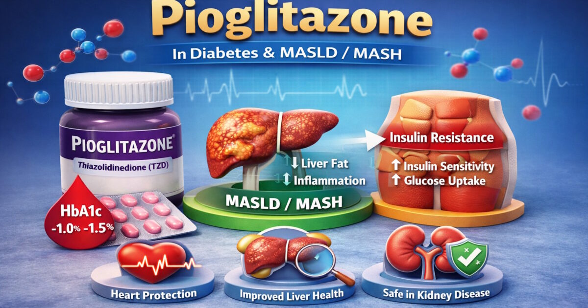 Pioglitazone là một thuốc hạ đường huyết đường uống có hiệu quả mạnh và bền vững, đặc biệt hữu ích trong điều trị đái tháo đường type 2 (ĐTĐ type 2) có đề kháng insulin và gan nhiễm mỡ do rối loạn chuyển hóa (MASLD/MASH).